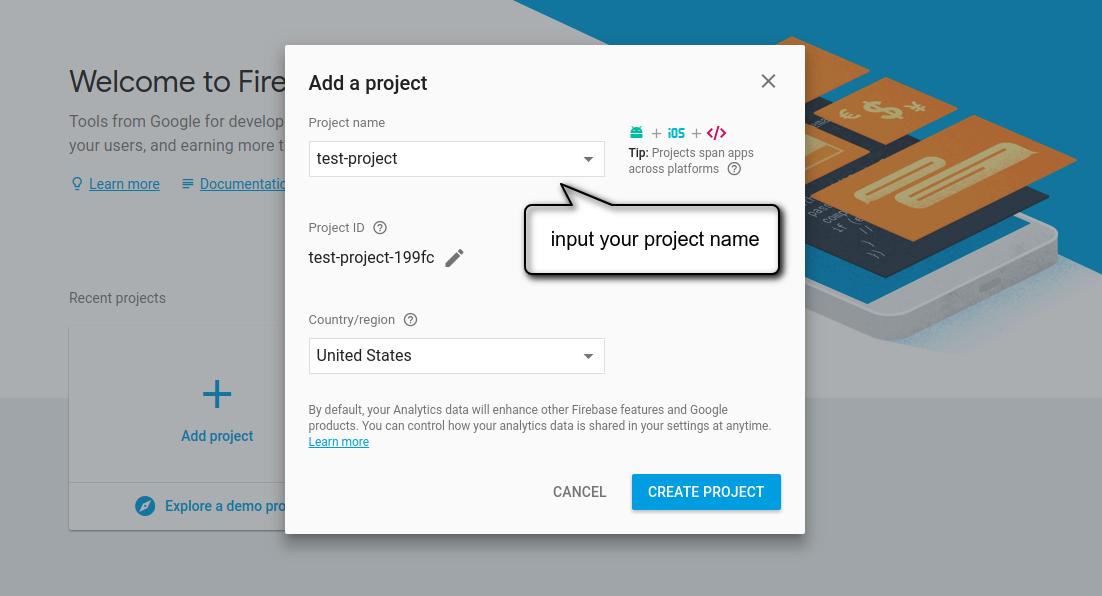 • Input project name (ex. test-project) and Select your Country. Then click on CREATE PROJECT to complete the process.
