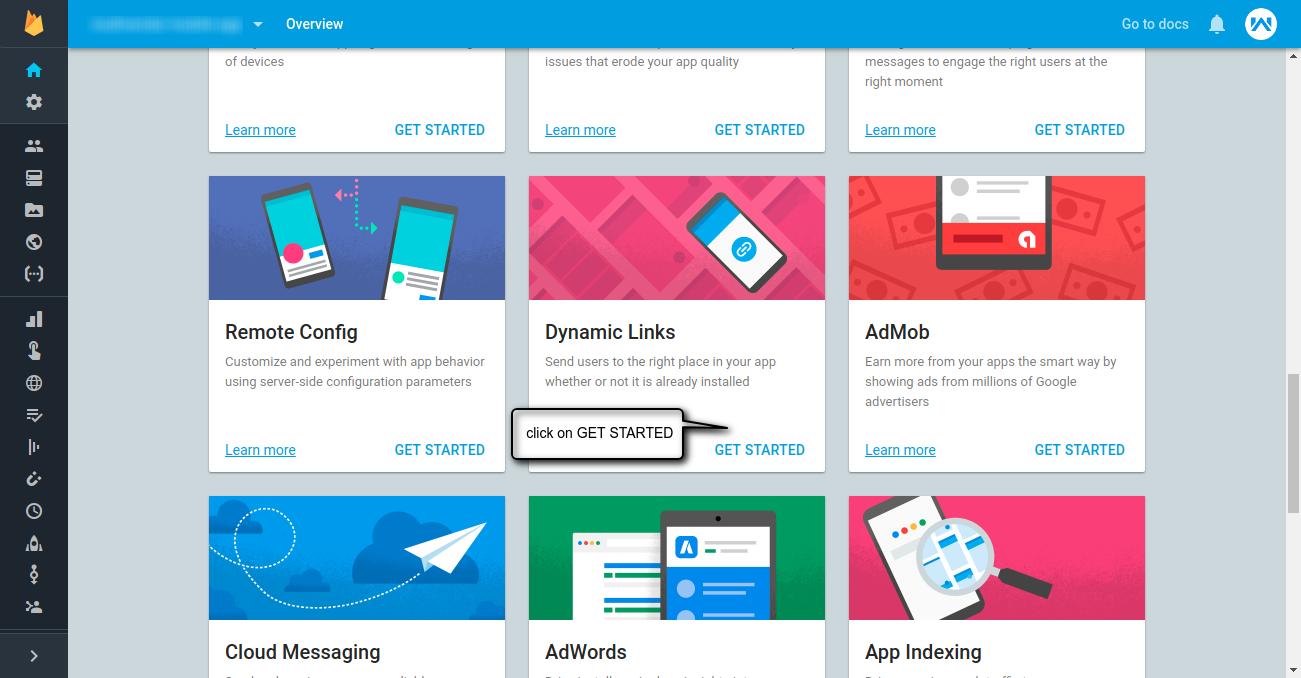 • Scroll to Dynamic Links card stated on your homepage and Click on GET STARTED.