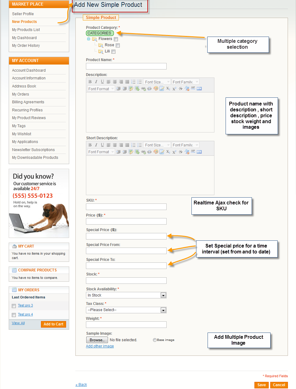 Add product screen will look something like that. Also proper validation has been applied for seller product add screen with live Ajax check for product SKU.