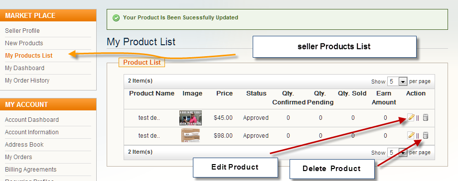 After successful product addition (if in the module admin product moderation is set NO then product will be approved automatically) seller can edit or delete the added product and can manage by their end using under my product list.