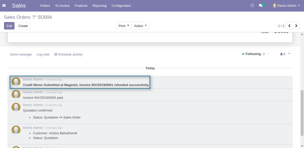 4. Login to the Odoo Backend, select the sales order for which you have created order refund.