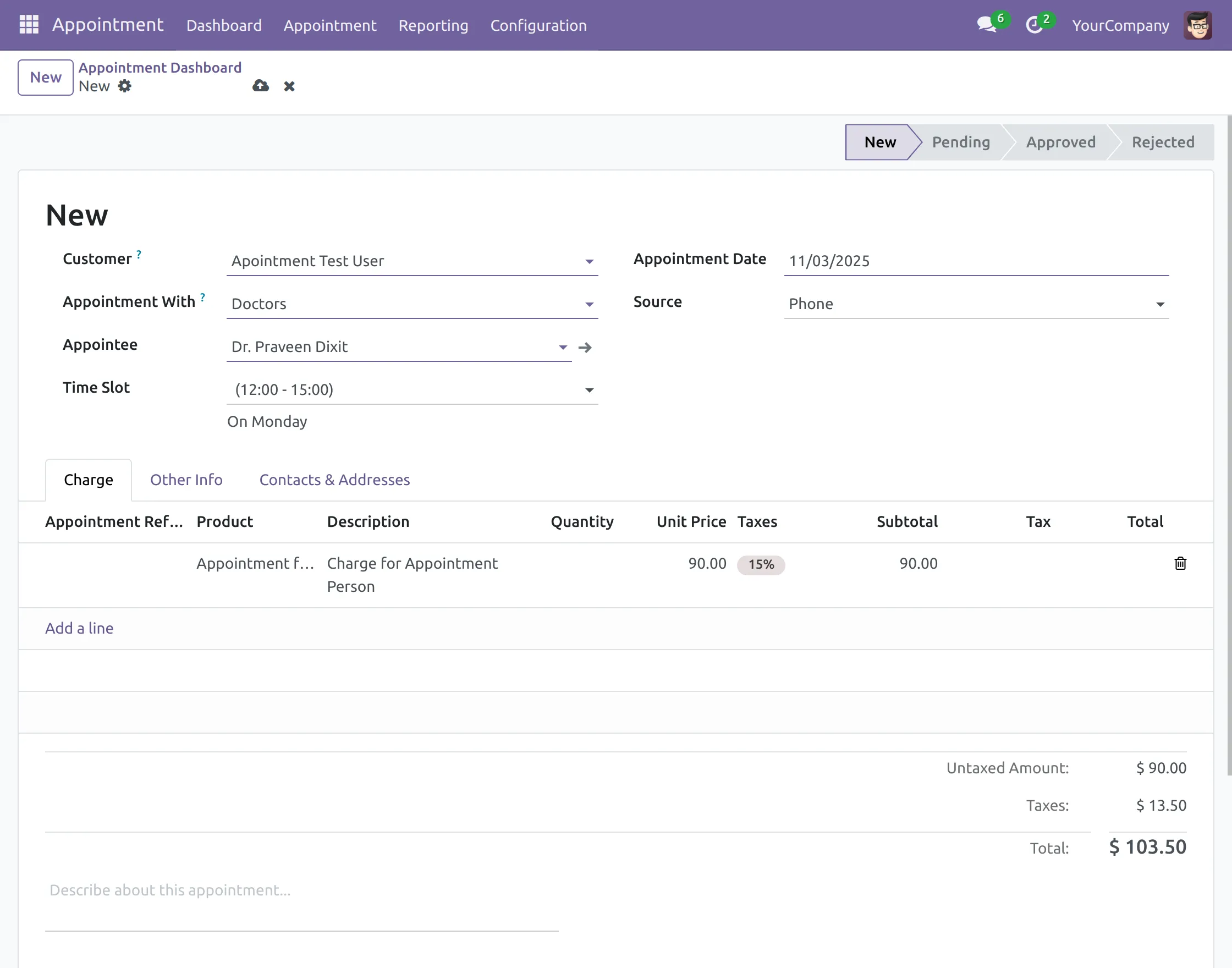 9. In the form, fill in ‘Customer, Appointment date, Appointment with (Appointment Group), Appointee, Source, and TimeSlot.’ In the ‘Charge’ tab, click ‘Add a Line’ and select the product or service required.