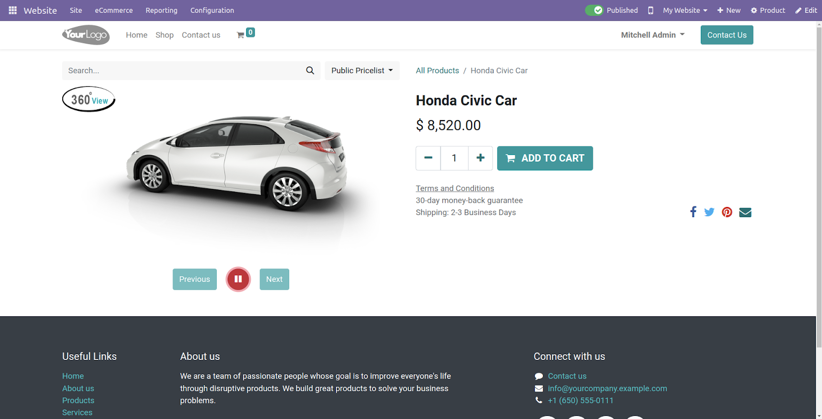 Further, the module allows adding images from the Odoo backend, which it uses to display a 360-degree rotating view.