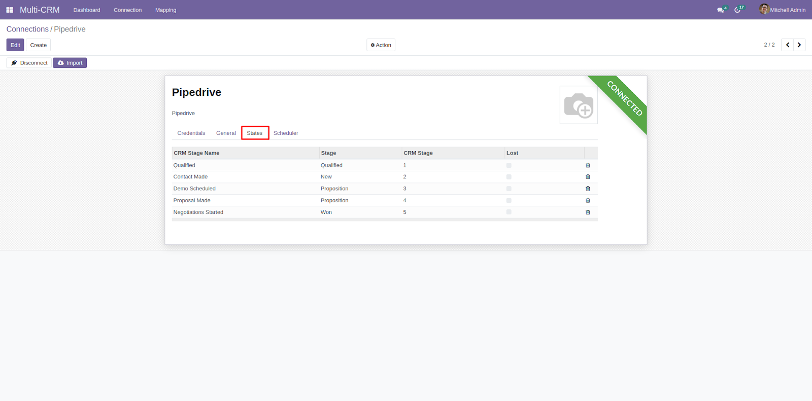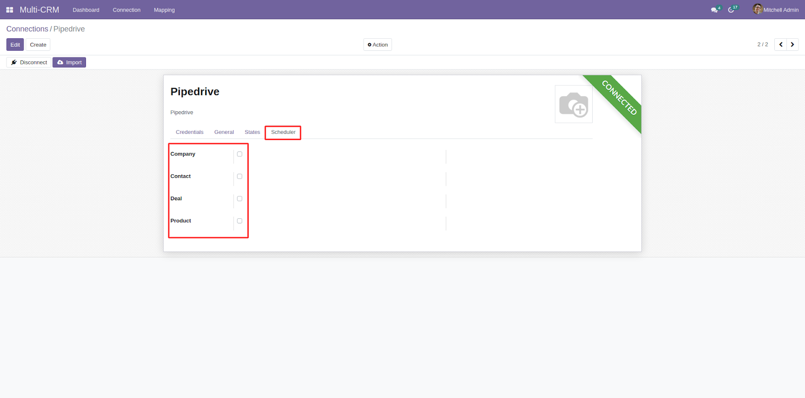 1. Firstly, log in to your Odoo backend and then go to ‘Multi-CRM> Connection> Pipedrive’ to view the connection status.